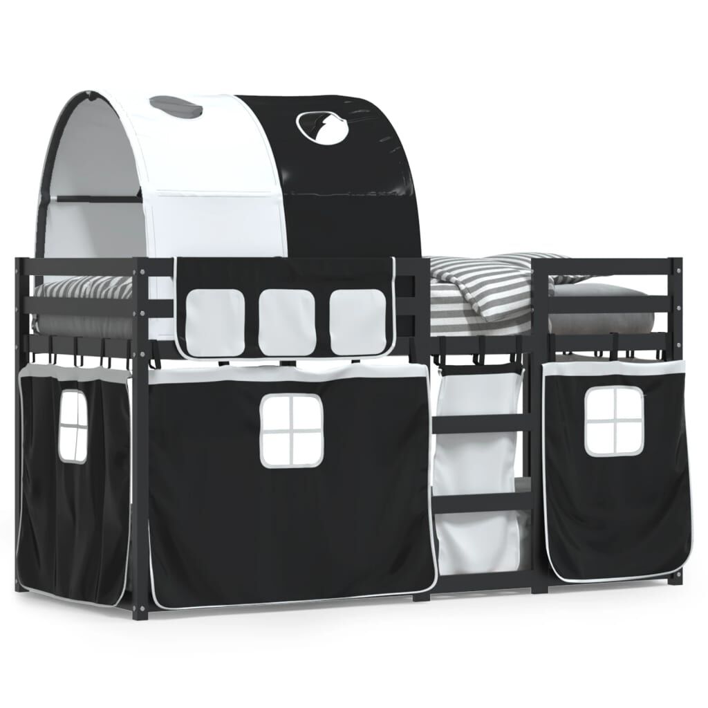 vidaXL Pat supraetajat de copii perdele, alb/negru, 90x200 cm lemn pin