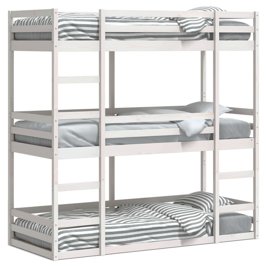 Acest pat supraetajat triplu, din lemn, este elegant și funcțional, fiind un plus perfect pentru orice cameră cu spațiu limitat.